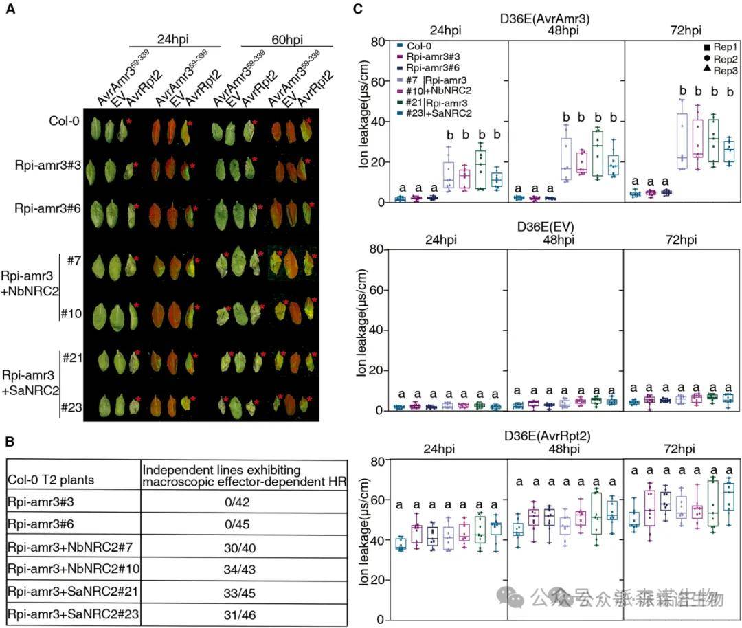 為了測試茄科NLRs在非薔薇科如擬南芥中的功能,作者構建了表達載體1:感受型NLR、載體2:同時表達感受型和輔助NLR的載體,并在煙草NRC2/3/4敲除突變體中進行測試,發現共表達Bs2、NbNRC2、AvrBs2會引起HR, 共遞送Rpi-amr3、NbNRC2、AvrAmr3會引起HR,而單獨遞送Bs2或Rpi-amr3則不會引起HR(圖S2A-B)。