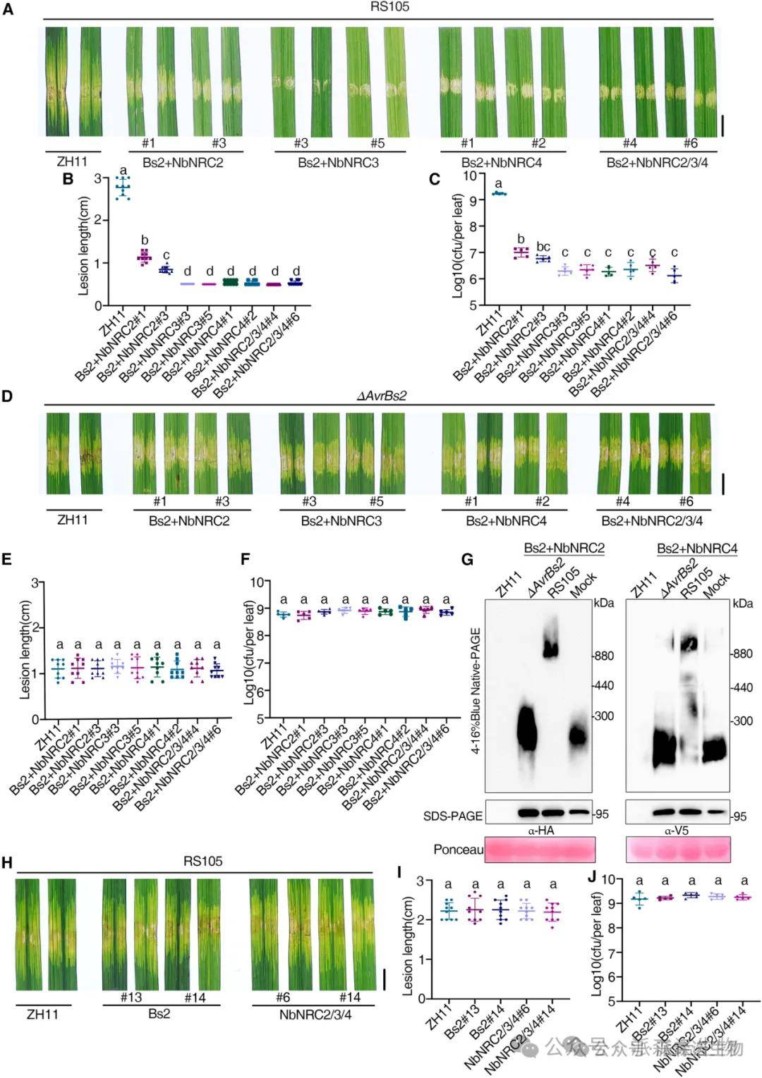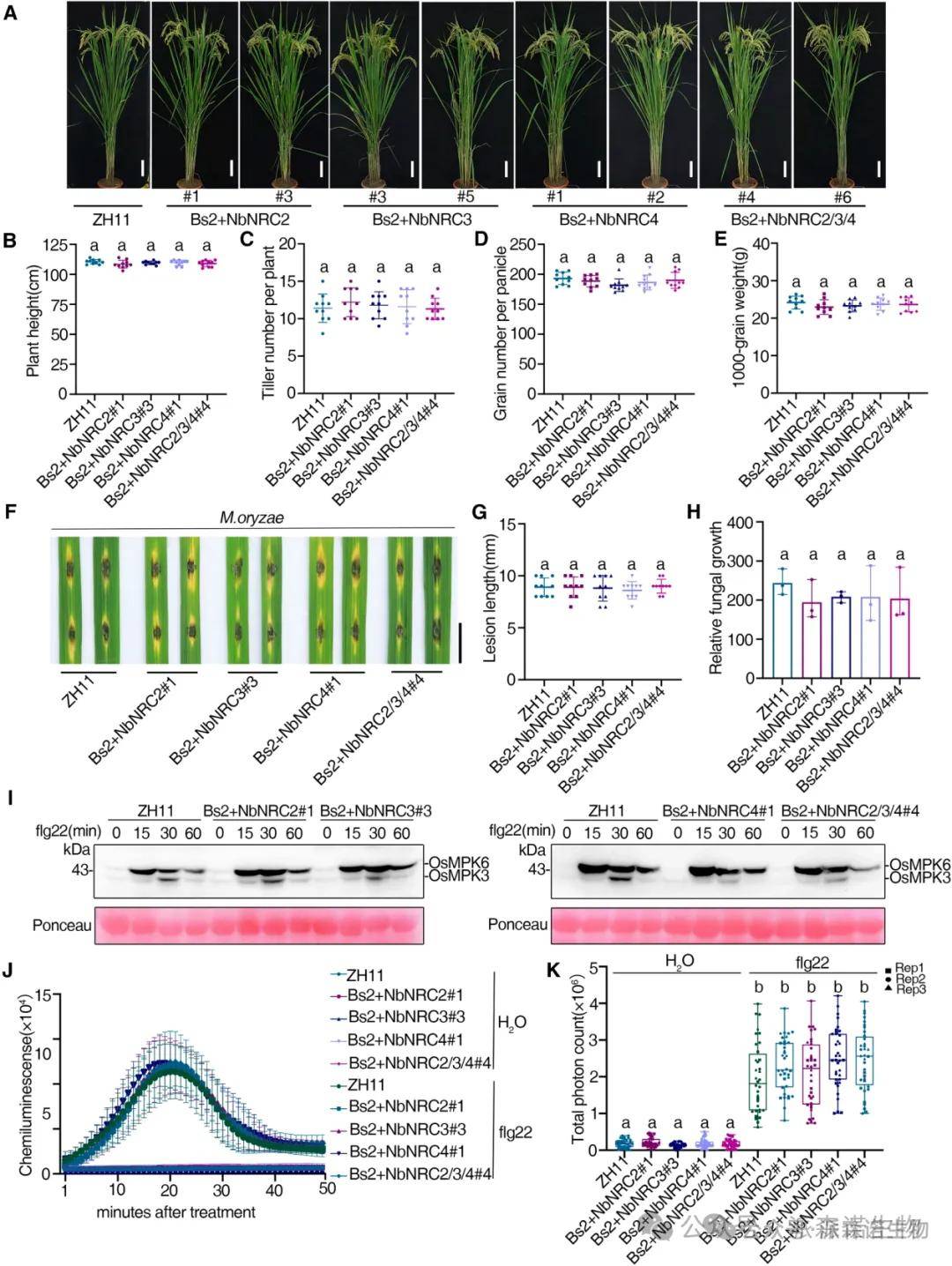 在煙草、大豆和擬南芥中,共表達感受型 NLR 和相應的輔助型NLR 可有效識別特定的病原菌效應子,并觸發免疫反應。特別在水稻中,轉基因水稻共表達 Bs2 和 NbNRC3 或 NbNRC4 時,對 Xoc 表現出完全抗性,與 NbNRC2 共表達時表現出部分抗性,而單獨表達 Bs2 或僅表達 NbNRCs 的轉基因水稻則無抗性。此外,轉基因水稻在田間表現出與野生型相似的生長表型和農藝性狀,且基礎抗性未受影響,表明共轉移策略不會對植物的正常生長和適應性產生負面影響。同時,轉基因水稻在病原菌感染后能顯著上調防御相關基因的表達,進一步證明了其抗病機制的有效性。