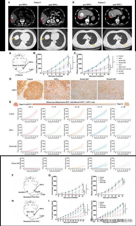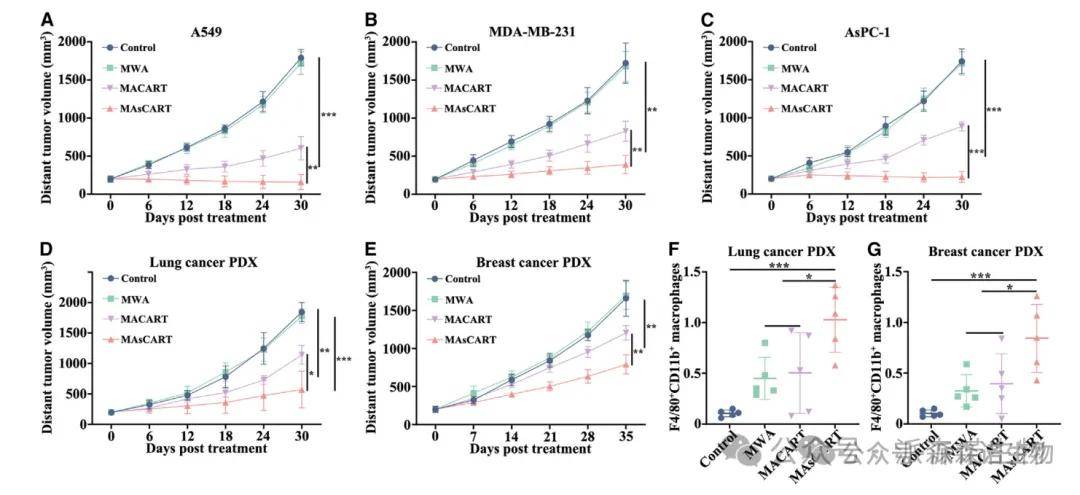 MWA不僅常用于HCC患者,還用于肺癌、胰腺癌和乳腺癌患者以及其他10種實體腫瘤患者。作者在NOG小鼠的幾種異種移植模型中觀察到了巨噬細胞依賴的遠隔效應。此外,為了密切模擬臨床患者中實體腫瘤的異質性,作者建立了肺癌和乳腺癌的患者源性異種移植PDX模型。在這些PDX模型中觀察到了遠隔效應,以及巨噬細胞向未消融腫瘤部位的募集,這表明消融誘導的遠位反應可能不僅限于HCC,也可能存在于需要MWA治療的其他原發性或轉移性腫瘤中。這些結果突出了MWA聯合CAR-T治療方案的臨床轉化價值。