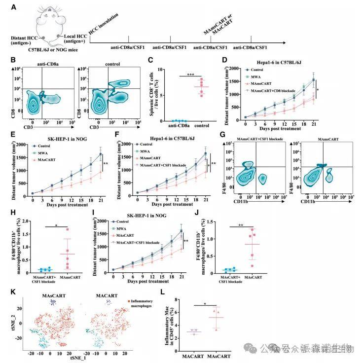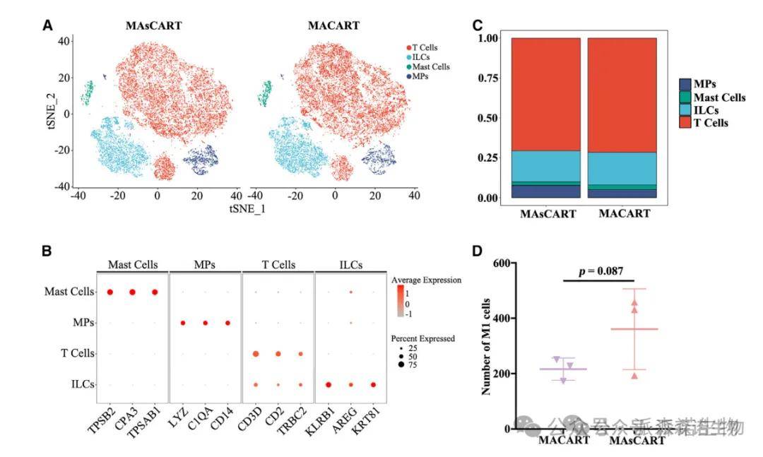 對非消融PDX腫瘤中MACART和MAsCART腫瘤團塊中的CD45免疫細胞進行了分選,使用單細胞RNA測序(scRNA-seq)分析。 scRNA-seq分析顯示,兩治療組之間上述細胞的總數沒有顯著差異。然而,與MACART相比,MAsCART中M1巨噬細胞的比例有增加的趨勢。這些觀察結果提供了一個可能,即MWA和CAR-T細胞的抗腫瘤作用可能與巨噬細胞有關。