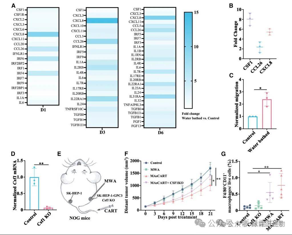 相對于對照組,在單獨MWA治療或MWA聯合治療中均觀察到未消融腫瘤中巨噬細胞的浸潤增加。對水浴SK-HEP-1-GPC3細胞的bulk RNA-seq、ELISA數據進行分析后發現,可招募巨噬細胞的幾種趨化因子升高,包括CSF1、CCL26、CXCL8等。鑒于已有研究表明癌細胞分泌的CSF1能招募巨噬細胞到腫瘤中,作者進一步調查了CSF1是否與遠隔效應有關。研究發現,當消融細胞進行Csf1基因敲除時,募集到未消融位點的巨噬細胞數量減少。這些數據表明,HCC細胞在消融腫瘤部位分泌CSF1有助于巨噬細胞遷移至未消融腫瘤部位,從而誘導遠隔效應。