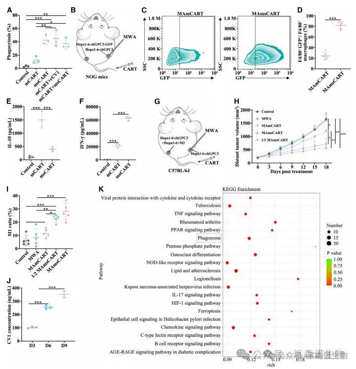 MAsCART在未消融腫瘤中誘導的遠隔效應優于MACART,這引發了這樣一個問題:CD47-SIRPa軸的阻斷劑CV1是否通過增強巨噬細胞的吞噬作用以驅動遠隔效應?相比之下,含有GPC3-msCART上清液的共培養物中干擾素(IFN)-g的分泌量明顯更高。這表明,GPC3-msCART細胞可以逆轉M2巨噬細胞的功能性免疫抑制,促進免疫激活和腫瘤裂解。這些數據支持這樣的假設,即腫瘤中局部msCAR-T細胞增殖和激活后,腫瘤內可能會出現更高的CV1濃度。KEGG分析顯示,MAsCART組中吞噬體基因相對于MACART組富集。更重要的是,這種體外效應并沒有伴隨著外周血紅細胞和免疫細胞或血清生化物質的明顯變化。這些數據證明了msCAR-T細胞改善吞噬免疫抑制的能力,很可能是通過CV1的分泌來實現的。