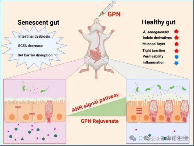 GPN提高老年小鼠腸道中A. senegalensis的豐度,促進色氨酸代謝和吲哚產生,激活AhR通路,觸發與腸道屏障和干細胞相關的基因表達,抑制年齡相關的腸道屏障功能障礙和炎癥。