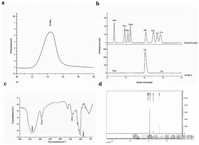 從人參中提取的粗多糖中分離出兩個組分,GPN和人參酸性多糖,選擇其中得率更高的GPN(88%)進行后續實驗,通過高效凝膠滲透色譜(HPGPC)、對傅里葉變換紅外光譜分析(FT-IR)和1H 核磁共振(1H NMR)光譜進行理化表征,發現GPN主要含有葡萄糖、甘露糖和阿拉伯糖,是人參的水溶性中性葡聚糖(圖2)。