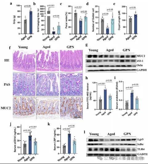 動物實驗發現,GPN給藥可以恢復老年小鼠的腸道屏障(減輕老年小鼠腸道屏障損害和干細胞耗竭),減輕衰老表型并抑制全身炎癥,同時改善老年小鼠的生理功能,具體表現為:小鼠的握力、懸掛時間、每個絨毛的杯狀細胞數量和糞便含水量等都顯著增加;小腸結構完整性下降,腸絨毛變短且部分脫落、固有層結締組織疏松等形態學改變得到恢復;隱窩深度和絨毛長度有所增加,并恢復了緊密連接蛋白 ZO-1、Occludin 以及 MUC2 的水平(圖3)。