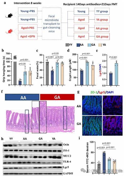 FMT實驗以及用抗生素混合物消耗微生物群發現,老年受體小鼠的全身性炎癥和腸道通透性在一定程度上得到改善,具體表現為接受 GPN 處理供體糞菌的老年受體小鼠衰老表型減輕、糞便含水量以及ZO-1 和 Lgr5 的表達顯著增加,隱窩深度和絨毛長度顯著恢復。上述結果表明,GPN 介導的腸道屏障修復是通過細菌間接實現的,而非直接作用(圖4)。