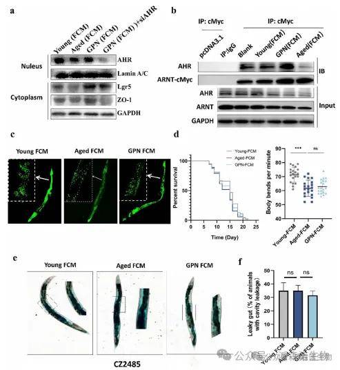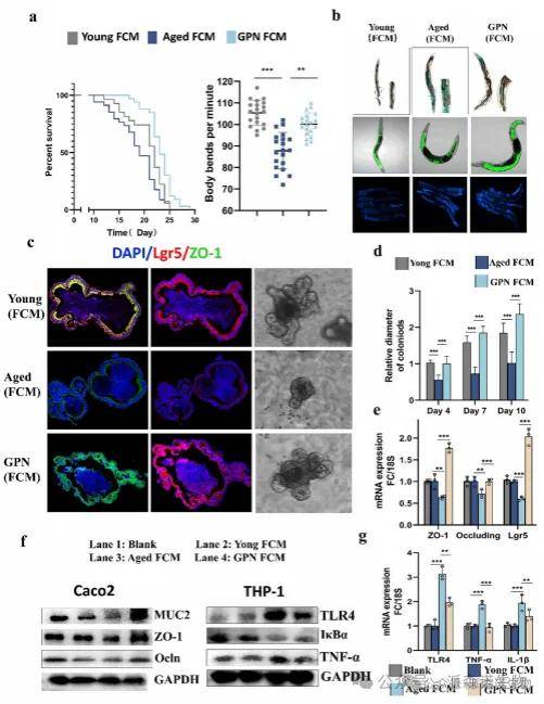 為了驗證治療效果是來自腸道菌群本身還是來自腸道細菌產生的代謝物,研究人員制備了FCM來飼喂秀麗隱桿線蟲以及小鼠,發現GPN 處理可以延長線蟲壽命、改善運動能力,以及改善腸道干細胞的再生潛能和屏障功能,證明了GPN 處理小鼠的細菌衍生代謝物可重現糞菌移植對腸道功能的影響,恢復腸道緊密連接結構并緩解衰老表型。進一步通過人巨噬細胞和人腸道上皮細胞的共培養系統,證實了GPN相關代謝物主要通過增強腸道上皮細胞中緊密連接蛋白的表達來降低上皮通透性,進而減輕炎癥(圖5)。