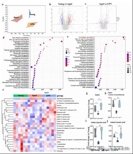 對糞便進行非靶代謝組學分析,發現老年組腸道的代謝物特征與青年組不同,且GPN喂養小鼠的代謝物形成了與老年組不同的聚類。與老年小鼠相比,GPN處理組牛磺酸、吲哚、吲哚衍生物和犬尿氨酸等年齡相關代謝物含量更高。與青年組相比,老年組色氨酸代謝通路的關鍵代謝物如煙酸、吲哚及其衍生物等含量降低,而GPN處理后這些物質表達量得以恢復(圖6)。