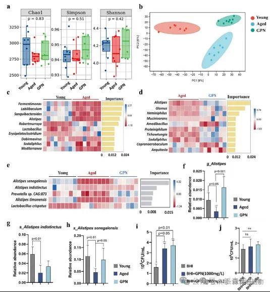 通過宏基因組測序分析發現,青年組、老年組和 GPN 處理組的菌群組成存在顯著差異,與青年組相比,Alistipes屬在老年小鼠中減少,而在GPN處理組中顯著富集(圖8)。進一步分析發現,GPN體外處理可以特異性刺激Alistipes的生長,細菌豐度、吲哚水平以及與炎癥及衰老相關的參數之間的相關性分析表明, A. senegalensis豐度最高且與老年小鼠的色氨酸代謝水平呈正相關,與全身性炎癥呈負相關(圖9)。