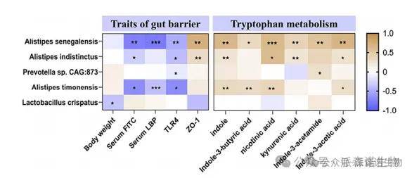 圖9 top5細菌與腸道屏障和色氨酸代謝水平之間的相關性分析