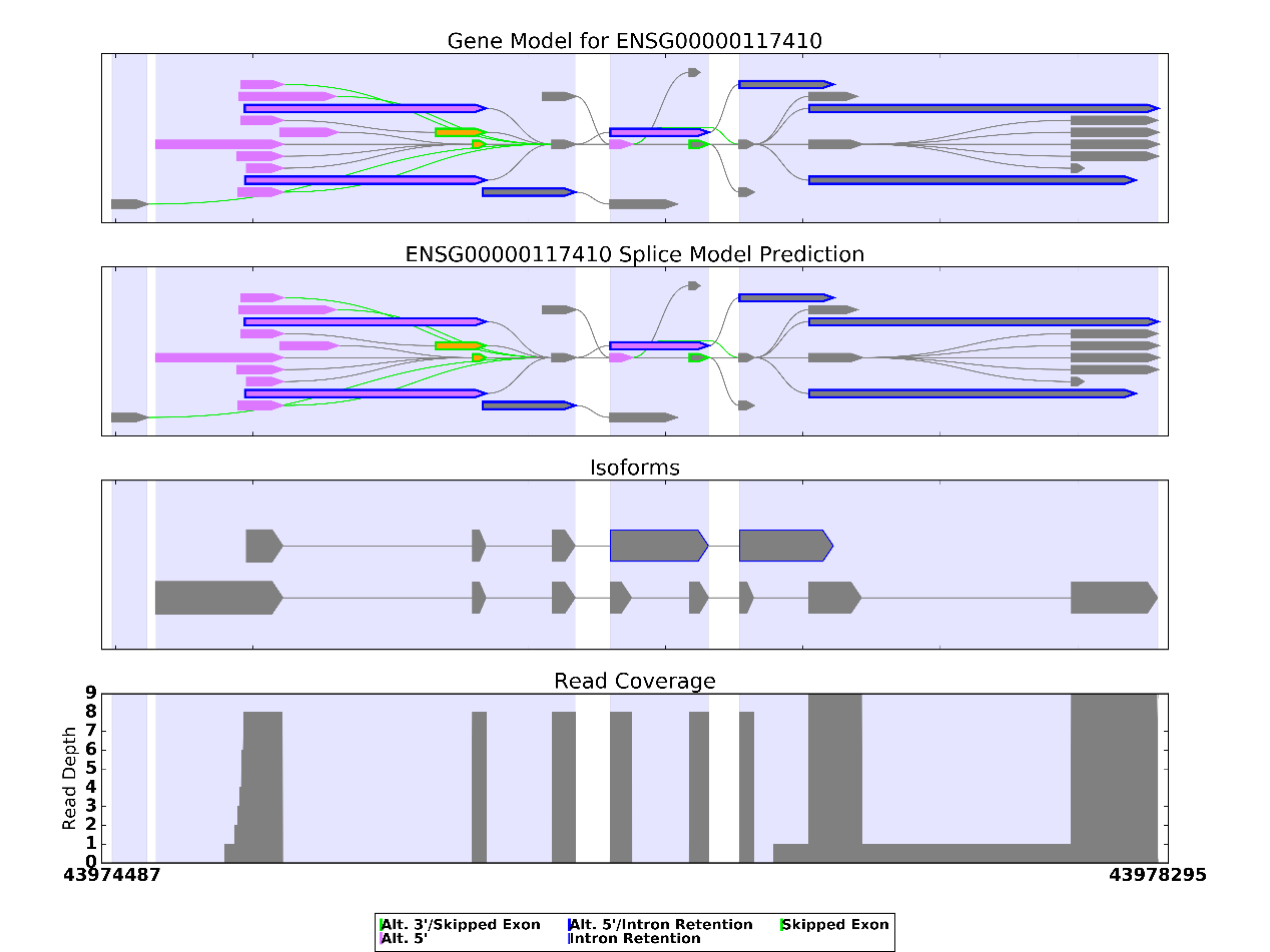 上圖左下角和右下角的數字分別代表該基因的起始位點和終止位點。該圖一共分4行,第一行為以該基因的注釋文件作出的基因模型,第二行為根據測序結果與注釋文件共同作出的基因模型,第三行也是根據測序結果與注釋文件共同作出的基因模型,與第二行不同的是只是畫出isoform,第四行則是測序文件中支持各外顯子的reads數目。灰色的五邊形代表外顯子,它們之間的連線表示不同的剪接方式。紫色背景表示有外顯子出現的區域(這其中包括保留的內含子),白色背景表示沒有外顯子出現的區域(即內含子區域)。圖中白色背景的寬度并不代表真實的內含子長度,由于有的基因內含子區域遠比外顯子區域長,為了更清楚地展示可變剪切模型,內含子區域會被縮短很多。