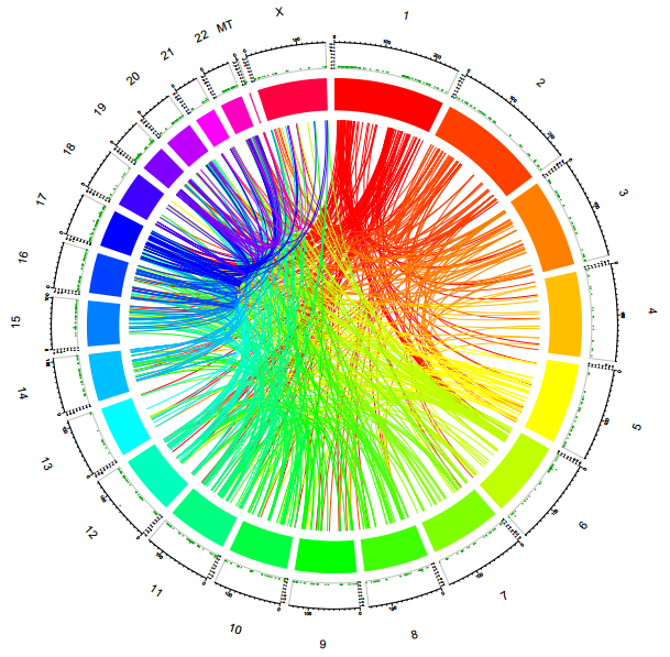 內圈以連線的形式展示了融合基因的兩個組成基因在染色體上的分布位置,外圈則以散點圖的形式展示了各位點上的基因成為多少種融合基因的組成成分的情況。