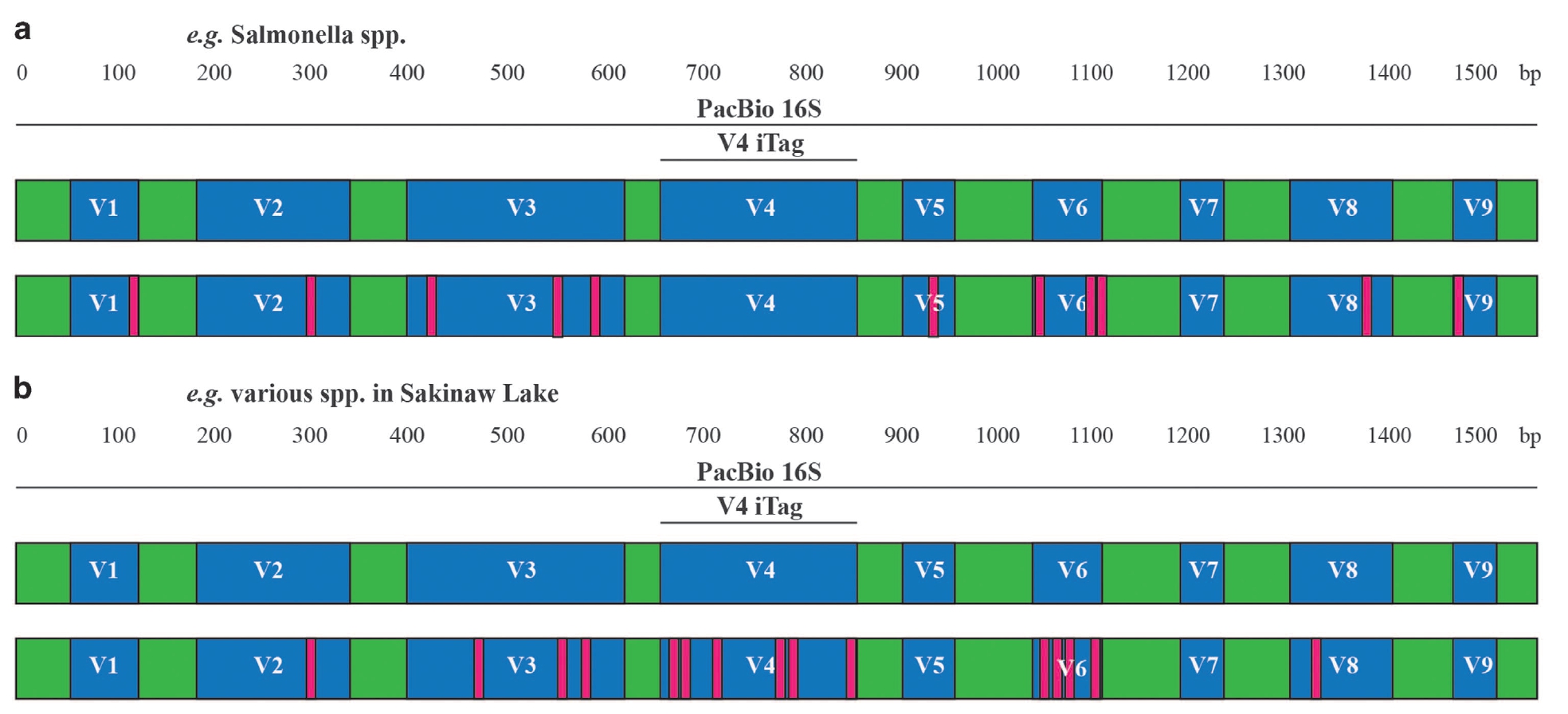 16S rRNA基因各V區的序列保守性并不一致,因而基于16S rRNA基因全長序列的三代測序,可以反映物種的種屬信息。a圖,以Salmonella屬為代表,全長序列的種間差異達到97.4%,但V4區高度保守,二代測序結果將低估該物種的多樣性;b圖,某些物種在V4區的多樣性可能高于其他V區,因而二代測序結果將高估相關物種的多樣性。*