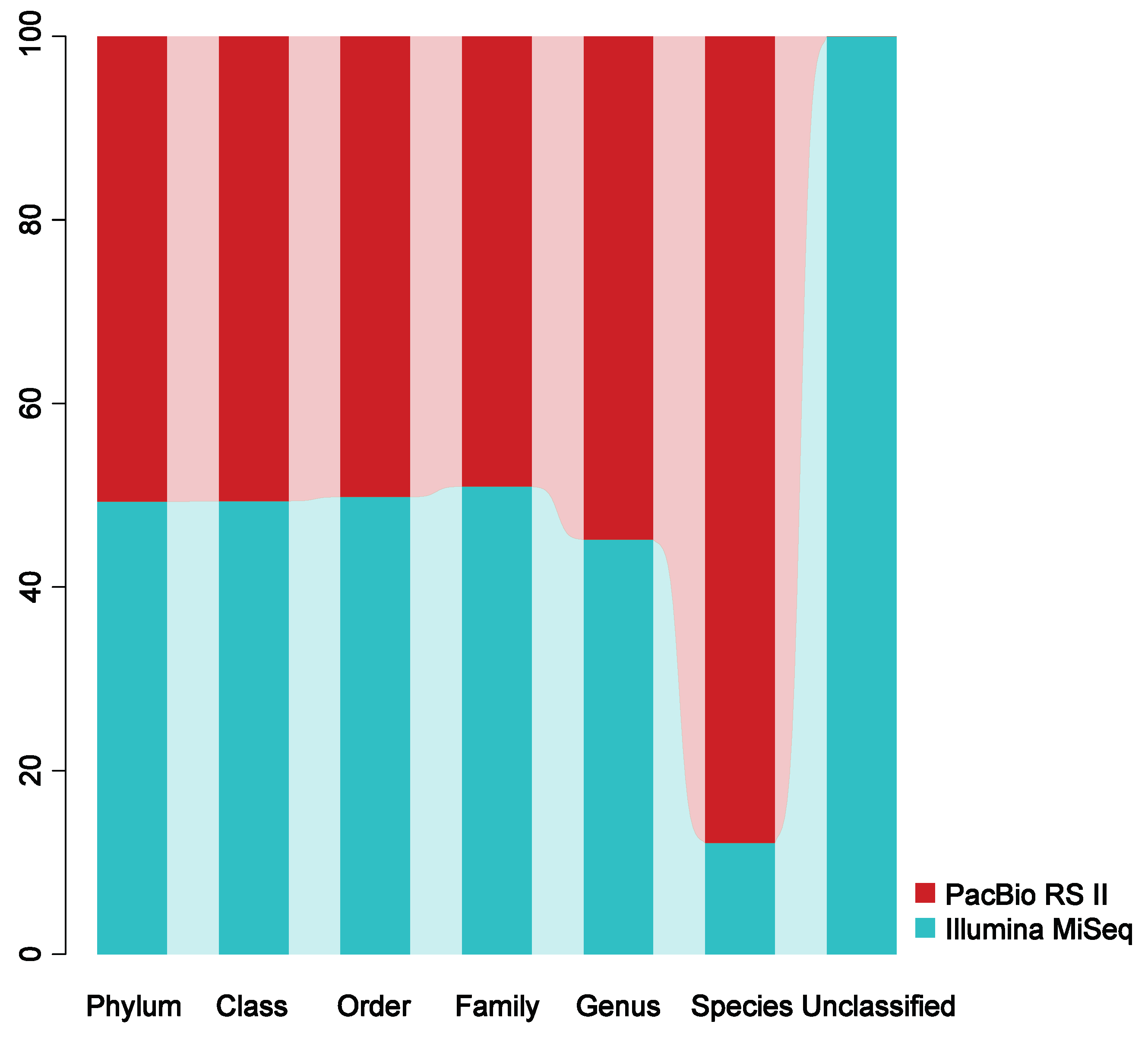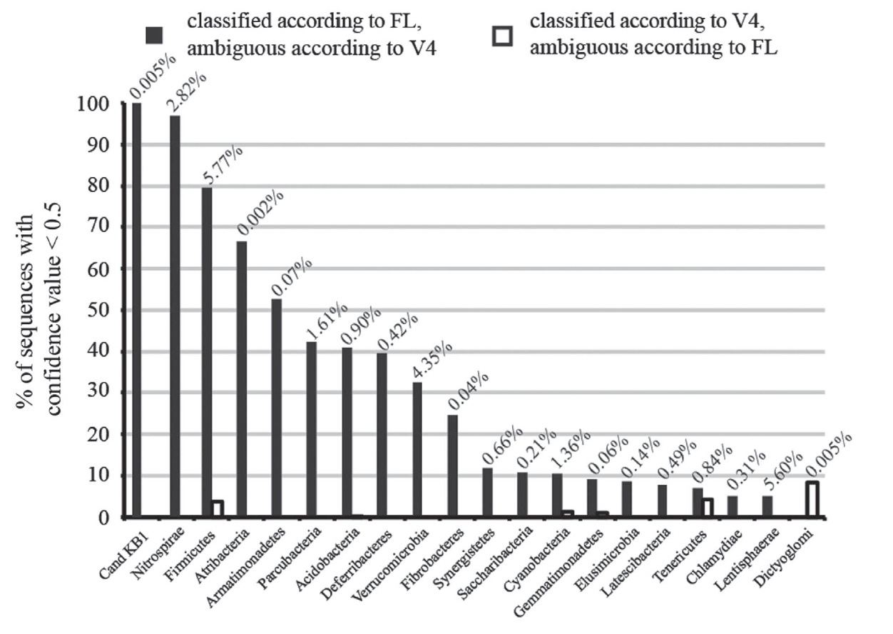 兩種平臺測序結果的精細比較,三代測序的結果降低了物種分類信息的不確定性。*